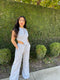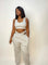 This geometric two piece set is comfy and chic with its “X” designed pants and sporty top. Worn casually or dressed up with a bag and accessories, this fit is sure to draw attention. Model is 5’6” wearing a medium.